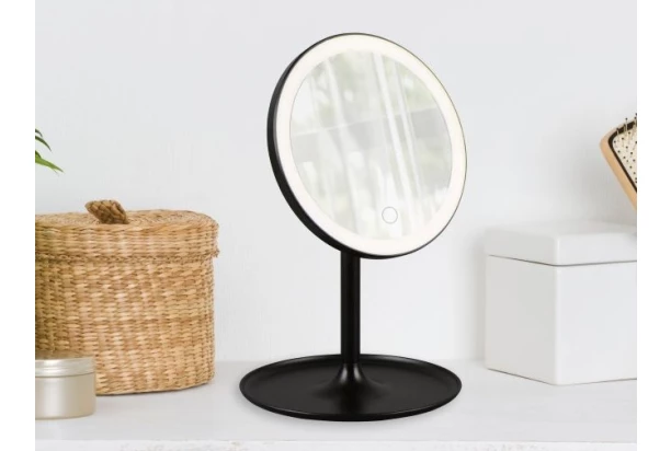 Praktické stolné kozmetické zrkadlo v čiernej farbe s integrovaným LED osvetlením je ideálne na každodenné líčenie, úpravu vlasov či starostlivosť o pleť. Vďaka kompaktnej veľkosti 18×28,5 cm sa ľahko prenáša aj umiestňuje.