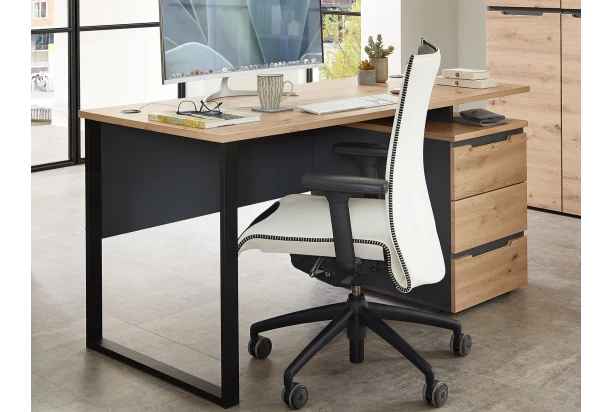 Písací stôl z kancelárskeho programu Memphis – moderný nábytok v kontrastnej kombinácii matný grafit s útulným drevodekorom dub artisan. Tento stôl s veľkou pracovnou plochou o veľkosti 120×77 cm cm sa hodí do každej modernej kancelárie alebo domácej pracovne. Kovová podnož stola poskytuje kvalitnú stabilitu pri práci.