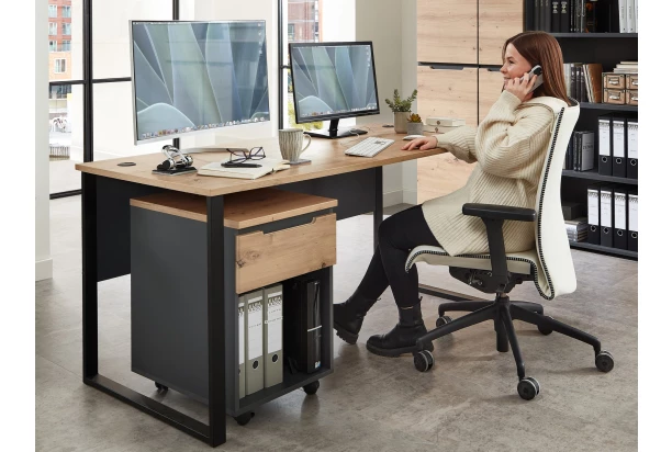 Písací stôl z kancelárskeho programu Memphis – moderný nábytok v kontrastnej kombinácii matný grafit s útulným drevodekorom dub artisan. Tento stôl s veľkou pracovnou plochou o veľkosti 170×77 cm cm sa hodí do každej modernej kancelárie alebo domácej pracovne. Kovová podnož stola poskytuje kvalitnú stabilitu pri práci.