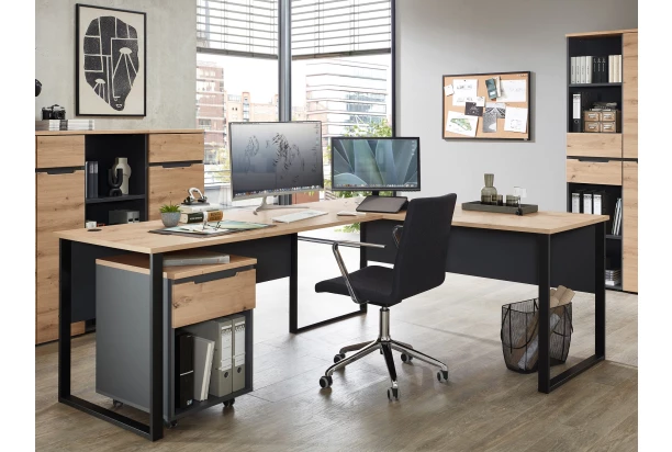 Rohový písací stôl z kancelárskeho programu Memphis – moderný nábytok v kontrastnej kombinácii matný grafit s útulným drevodekorom dub artisan. Tento stôl s veľkou pracovnou plochou sa hodí do každej modernej kancelárie alebo domácej pracovne. Stôl je možné univerzálne zmontovať ako pravý alebo ľavý roh, respektíve s dlhšou stranou napravo alebo naľavo.