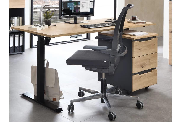 Písací stôl s elektrickým nastavením výšky z programu Memphis – moderný nábytok v kontrastnej kombinácii matný grafit s útulným drevodekorom dub artisan. Stôl s priestrannou pracovnou plochou sa hodí do každej modernej kancelárie alebo domácej pracovne. Tento stôl s elektricky výškovo nastaviteľným mechanizmom Vám spríjemní prácu – pomocou panelu s tlačidlami si pracovnú plochu stola kedykoľvek, ľahko a rýchlo prispôsobíte aktuálnej potrebe. Môžete tak pracovať striedavo posediačky aj postojačky, čo ocení hlavne Váš chrbát. Stôl má navyše funkciu pamäte pre vaše obľúbené polohy.