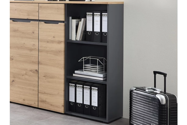 Úzky vysoký regál z kancelárskeho programu Memphis – moderný nábytok v elegantnom prevedení matný grafit, doplnený o hornú kryciu dosku v útulnom drevodekore dub artisan. Odkladacie police sú ideálne na usporiadanie kníh, zložiek a pracovných materiálov v pracovni, kúpeľňových potrieb v kúpeľni alebo dekoratívnych predmetov v obývacej izbe. Regál je možné využiť v akejkoľvek miestnosti.