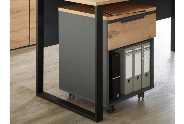 Úložný kontajner so zásuvkou z kancelárskeho programu Memphis – nábytok v modernom a zároveň funkčnom dizajne zaujme zaujímavou profiláciou predných plôch. Nábytok je vyrobený v kontrastnej kombinácii matný grafit s útulným drevodekorom dub artisan. Tento kontajner sa hodí do každej modernej kancelárie alebo domácej pracovne. Kontajner má zásuvku a odkladaciu priehradku. Určený ideálne pre umiestnenie k písaciemu stolu a vďaka kolieskam sa dá ľahko presúvať.