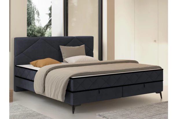 Moderná dvojlôžková posteľ s krásnym geometrickým prešivom zaujme v priestore každej spálne. Posteľ o veľkosti lôžka 180×200 cm je očalúnená zamatovo lesklou látkou vo farbe tmavo šedá, ktorá pôsobí luxusne a zároveň je odolná. Súčasťou tejto postele sú kvalitné vysoké matrace s taštičkovým jadrom a studenou penou, ktoré zaistia optimálny komfort počas spania. Lôžko vo vyššej polohe je obľúbené, pretože sa z neho lepšie vstáva. V dolnej časti postele sú ukryté praktické úložné priestory, ktoré sú prístupné z prednej strany – pohodlne do nich uschováte napríklad posteľnú bielizeň. Vďaka zvýšenej konštrukcii na nožičkách je údržba podlahy pod posteľou jednoduchšia a môžete využiť napríklad aj robotický vysávač.