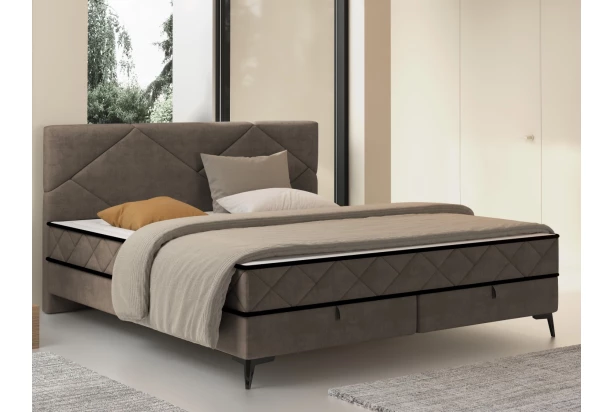 Moderná dvojlôžková posteľ s krásnym geometrickým prešivom zaujme v priestore každej spálne. Posteľ o veľkosti lôžka 180×200 cm je očalúnená zamatovo lesklou látkou vo farbe svetlo hnedá, ktorá pôsobí luxusne a zároveň je odolná. Súčasťou tejto postele sú kvalitné vysoké matrace spanie. Lôžko vo vyššej polohe je obľúbené, pretože sa z neho lepšie vstáva.