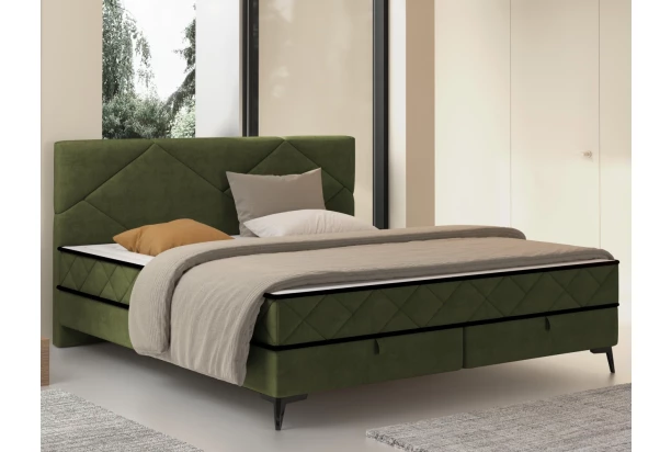 Moderná dvojlôžková posteľ s krásnym geometrickým prešivom zaujme v priestore každej spálne. Posteľ s veľkosťou lôžka 160×200 cm je očalúnená zamatovo lesklou látkou vo farbe machovo zelená, ktorá pôsobí luxusne a zároveň je odolná. Súčasťou tejto postele sú kvalitné vysoké matrace s taštičkovým jadrom a studenou penou, ktoré zaistia optimálny komfort počas spania. Lôžko vo vyššej polohe je obľúbené, pretože sa z neho lepšie vstáva. V dolnej časti postele sú ukryté praktické úložné priestory, ktoré sú prístupné z prednej strany – pohodlne do nich uschováte napríklad posteľnú bielizeň. Vďaka zvýšenej konštrukcii na nôžkach je údržba podlahy pod posteľou jednoduchšia a môžete využiť napríklad aj robotický vysávač.
