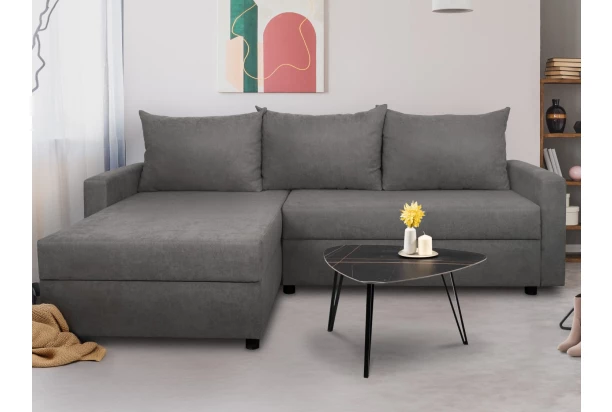 Malá rohová sedačka má otoman s možnosťou umiestnenia na pravú alebo ľavú stranu – je teda univerzálna pre umiestnenie do každej obývačky. Sedačka je očalúnená látkou vo farbe stredne šedá a doplnená príjemne mäkkými vankúšmi pre pohodlné opretie. Využijete aj funkciu rozkladu na lôžko na príležitostné spanie a úložný priestor, ktorý je ukrytý pod sedákom