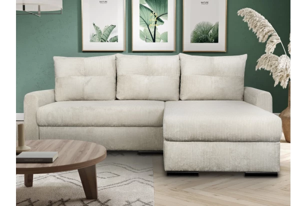 Malá elegantná rohová sedačka s pohodlnými vankúšmi má zaoblené tvary a pasuje takmer do akéhokoľvek interiéru. Vďaka univerzálnej montáži môže tvoriť pravý alebo ľavý roh. Praktckou súčasťou je aj úložný priestor pod sedákom alebo o rozkladacie funkcie pre príležitostné spanie. Túto rohovú sedaciu súpravu ľahko umiestnite aj do malého priestoru obývačky alebo napríklad garsónky. Očalúnená mäkkučkou štruktúrovanou látkou vo farbe krémová, ktorá je veľmi útulná.