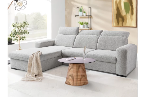 Rohová sedačka so zaoblenými tvarmi je ideálna voľba pre tých, ktorí hľadajú nadčasový elegantný štýl, ktorý je estetický aj funkčný zároveň. Polohovanie chrbtových opierok vám umožní usadiť sa ľahko v každej polohe. Pohodlné sedenie dopĺňa poťahová látka buklé s dlhším štruktúrovaným vlasom vo farbe svetlá šedo-béžová, ktorá je príjemne mäkká a vytvára útulnú atmosféru v obývačke. Rohová sedačka s otomanom tvorí ľavý roh. Pod otomanom nájdete praktický úložný priestor, kam uložíte napríklad deky alebo veci sezónnej potreby. Funkciu rozkladu na príležitostné lôžko ocení nielen vaša návšteva, ale aj vy počas chvíľ domácej relaxácie.