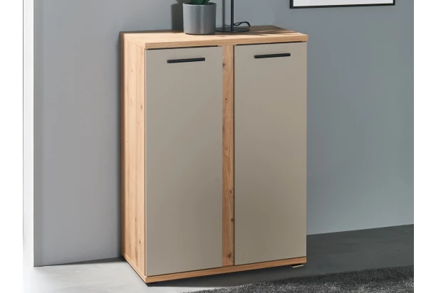Úložná skrinka z programu Kanada – moderný nábytok v kombinácii drevodekoru dub artisan s kašmírovo béžovými plochami vytvorí príjemné prostredie, kde sa budete cítiť útulne. Rovné línie nábytku ľahko pasujú do akéhokoľvek moderne zariadeného interiéru. So svojimi kompaktnými rozmermi sa dobre zmestí do menších miestností a napriek tomu ponúka dostatok miesta na uloženie kníh, šanónov a ďalších predmetov. Táto 2-dverová skrinka je všestranná a je ideálna do pracovne, chodby aj obývačky. S rozmermi 68×95×38 cm ponúka táto skrinka dostatok priestoru na prehľadné uloženie najrôznejších vecí.