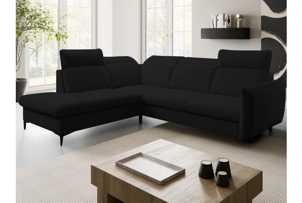 Trendová rohová sedačka s praktickou funkciou rozkladu a úložným priestorom pod otomanom. Komfortné sedenie je doplnené polohovateľnými opierkami, ktoré si môžete ľubovoľne nastavovať podľa aktuálnej potreby. Moderný členitý dizajn sedačky pripomína na pohľad vankúše, ktoré priam lákajú k pohodlnému posedeniu. Vďaka vyššej podnoži môžete počas upratovania využiť napríklad aj robotický vysávač. Táto varianta sedačky s otomanom vľavo tvorí ľavý roh a je očalúnená jemne štruktúrovanou látkou vo farbe čierna, ktorá je príjemne mäkká a zároveň odolná.