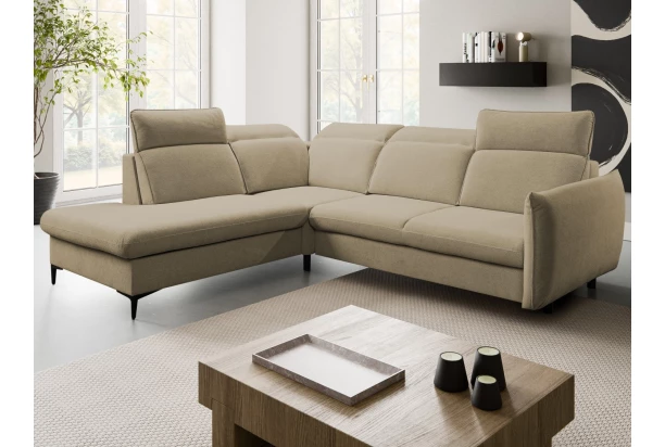 Trendová rohová sedačka s praktickou funkciou rozkladu a úložným priestorom pod otomanom. Komfortné sedenie je doplnené polohovateľnými opierkami, ktoré si môžete ľubovoľne nastavovať podľa aktuálnej potreby. Moderný členitý dizajn sedačky pripomína na pohľad vankúše, ktoré priam lákajú k pohodlnému posedeniu. Vďaka vyššej podnoži môžete počas upratovania využiť napríklad aj robotický vysávač. Táto varianta sedačky s otomanom vľavo tvorí ľavý roh a je očalúnená jemne štruktúrovanou látkou vo farbe svetlo hnedá, ktorá je príjemne mäkká a zároveň odolná.