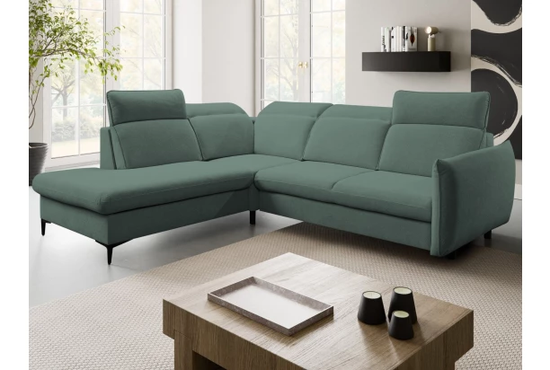Trendová rohová sedačka s praktickou funkciou rozkladu a úložným priestorom pod otomanom. Komfortné sedenie je doplnené polohovateľnými opierkami, ktoré si môžete ľubovoľne nastavovať podľa aktuálnej potreby. Moderný členitý dizajn sedačky pripomína na pohľad vankúše, ktoré priam lákajú k pohodlnému posedeniu. Vďaka vyššej podnoži môžete počas upratovania využiť napríklad aj robotický vysávač. Táto varianta sedačky s otomanom vľavo tvorí ľavý roh a je očalúnená jemne štruktúrovanou látkou vo farbe modro-šedo-zelená, ktorá je príjemne mäkká a zároveň odolná.