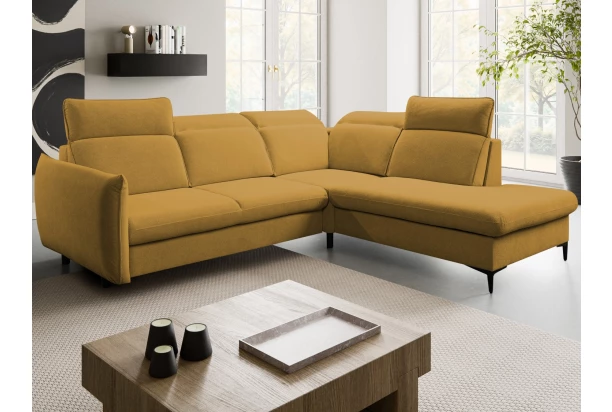 Trendová rohová sedačka s praktickou funkciou rozkladu a úložným priestorom pod otomanom. Komfortné sedenie je doplnené polohovateľnými opierkami, ktoré si môžete ľubovoľne nastavovať podľa aktuálnej potreby. Moderný členitý dizajn sedačky pripomína na pohľad vankúše, ktoré priam lákajú k pohodlnému posedeniu. Vďaka vyššej podnoži môžete počas upratovania využiť napríklad aj robotický vysávač. Táto varianta sedačky s otomanom vpravo tvorí pravý roh a je očalúnená jemne štruktúrovanou látkou vo farbe žltá, ktorá je príjemne mäkká a zároveň odolná.