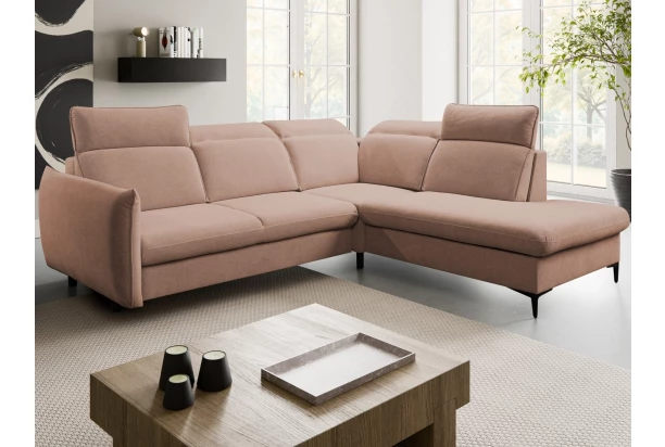 Trendová rohová sedačka s praktickou funkciou rozkladu a úložným priestorom pod otomanom. Komfortné sedenie je doplnené polohovateľnými opierkami, ktoré si môžete ľubovoľne nastavovať podľa aktuálnej potreby. Moderný členitý dizajn sedačky pripomína na pohľad vankúše, ktoré priam lákajú k pohodlnému posedeniu. Vďaka vyššej podnoži môžete počas upratovania využiť napríklad aj robotický vysávač. Táto varianta sedačky s otomanom vpravo tvorí pravý roh a je očalúnená jemne štruktúrovanou látkou vo farbe svetlo lososová, ktorá je príjemne mäkká a zároveň odolná.