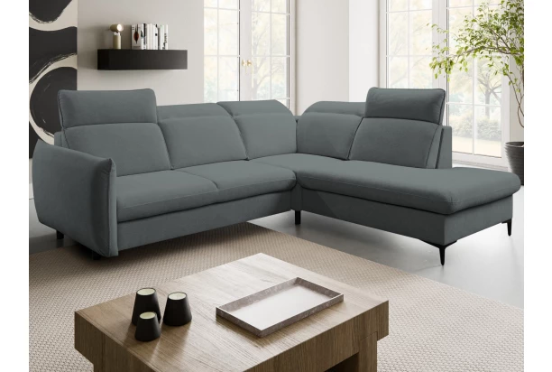 Trendová rohová sedačka s praktickou funkciou rozkladu a úložným priestorom pod otomanom. Komfortné sedenie je doplnené polohovateľnými opierkami, ktoré si môžete ľubovoľne nastavovať podľa aktuálnej potreby. Moderný členitý dizajn sedačky pripomína na pohľad vankúše, ktoré priam lákajú k pohodlnému posedeniu. Vďaka vyššej podnoži môžete počas upratovania využiť napríklad aj robotický vysávač. Tento variant sedačky s otomanom vpravo tvorí pravý roh a je očalúnený jemne štruktúrovanou látkou vo farbe stredne šedá, ktorá je príjemne mäkká a zároveň odolná.