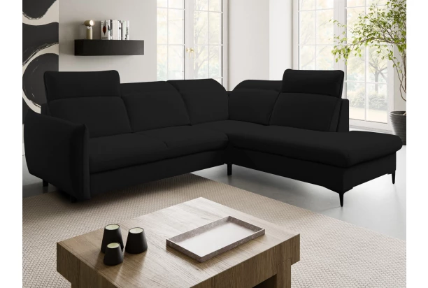 Trendová rohová sedačka s praktickou funkciou rozkladu a úložným priestorom pod otomanom. Komfortné sedenie je doplnené polohovateľnými opierkami, ktoré si môžete ľubovoľne nastavovať podľa aktuálnej potreby. Moderný členitý dizajn sedačky pripomína na pohľad vankúše, ktoré priam lákajú k pohodlnému posedeniu. Vďaka vyššej podnoži môžete počas upratovania využiť napríklad aj robotický vysávač. Tento variant sedačky s otomanom vpravo tvorí pravý roh a je očalúnený jemne štruktúrovanou látkou vo farbe čierna, ktorá je príjemne mäkká a zároveň odolná.á.