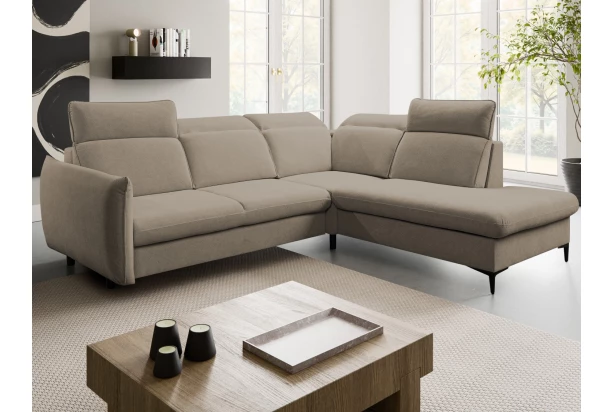 Trendová rohová sedačka s praktickou funkciou rozkladu a úložným priestorom pod otomanom. Komfortné sedenie je doplnené polohovateľnými opierkami, ktoré si môžete ľubovoľne nastavovať podľa aktuálnej potreby. Moderný členitý dizajn sedačky pripomína na pohľad vankúše, ktoré priam lákajú k pohodlnému posedeniu. Vďaka vyššej podnoži môžete počas upratovania využiť napríklad aj robotický vysávač. Tento variant sedačky s otomanom vpravo tvorí pravý roh a je očalúnený jemne štruktúrovanou látkou vo farbe hnedo-šedo-béžová taupe, ktorá je príjemne mäkká a zároveň odolná.