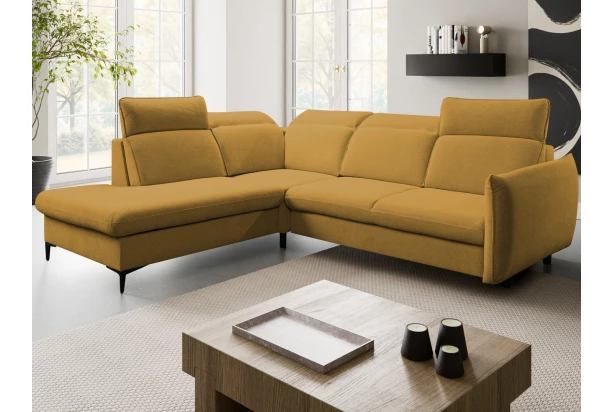 Trendová rohová sedačka s praktickou funkciou rozkladu a úložným priestorom pod otomanom. Komfortné sedenie je doplnené polohovateľnými opierkami, ktoré si môžete ľubovoľne nastavovať podľa aktuálnej potreby. Moderný členitý dizajn sedačky pripomína na pohľad vankúše, ktoré priam lákajú k pohodlnému posedeniu. Vďaka vyššej podnoži môžete počas upratovania využiť napríklad aj robotický vysávač. Táto varianta sedačky s otomanom vľavo tvorí ľavý roh a je očalúnená jemne štruktúrovanou látkou vo farbe žltá, ktorá je príjemne mäkká a zároveň odolná.