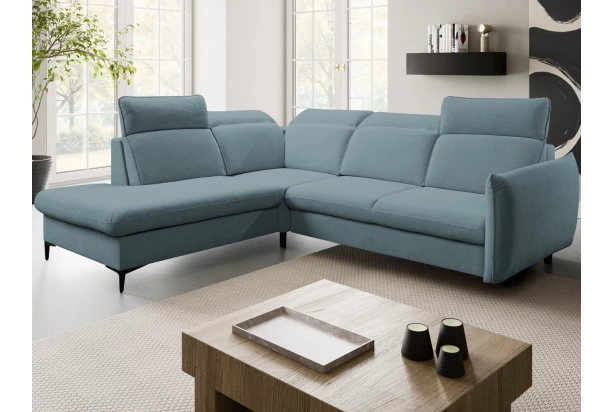 Trendová rohová sedačka s praktickou funkciou rozkladu a úložným priestorom pod otomanom. Komfortné sedenie je doplnené polohovateľnými opierkami, ktoré si môžete ľubovoľne nastavovať podľa aktuálnej potreby. Moderný členitý dizajn sedačky pripomína na pohľad vankúše, ktoré priam lákajú k pohodlnému posedeniu. Vďaka vyššej podnoži môžete počas upratovania využiť napríklad aj robotický vysávač. Táto varianta sedačky s otomanom vľavo tvorí ľavý roh a je očalúnená jemne štruktúrovanou látkou vo farbe svetlomodrá, ktorá je príjemne mäkká a zároveň odolná.