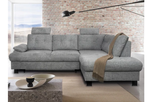 Komfortná rohová sedačka v zaoblených tvaroch má obľúbenú vankúšovú optiku, ktorá láka na príjemné posedenie. Atraktívne členité tvary dopĺňa decentné prešitie poťahu. Sedačka je očalúnená mäkko štruktúrovanou látkou vo farbe melírová holubia šedá a s bočným otomanom tvorí pravý roh. Táto sedačka je navyše vybavená 2 opierkami hlavy, ktoré môžete ľahko premiestniť na akékoľvek miesto. Po vyklopení otomanu nájdete dostatočný úložný priestor na ukladanie lôžkovín, deky, vankúšikov alebo napríklad sezónnych vecí. Táto sedačka je tiež vybavená rozkladacou funkciou, kedy sa premení na lôžko pre príležitostné spanie alebo relaxovanie. Celkový dizajn dopĺňajú čierne kovové nohy, ktoré dodávajú rohovej sedačke potrebnú stabilitu.