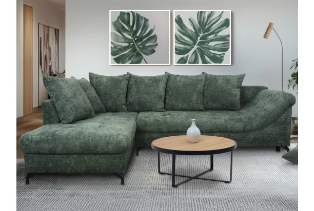 Elegantná rohová sedačka má komfortne zaoblený tvar, vďaka ktorému poslúži aj ako príjemné relaxačné lehátko. Pohodlné sedenie dopĺňajú veľké oporné vankúše. Sedačka s bočným otomanom tvorí ľavý roh a je očalúnená zamatovo hebkou štruktúrovanou tkaninou vo farbe šedo-zelená. Praktickou stránkou sedačky je funkcia rozkladu na príležitostné lôžko a úložný priestor, kam uschováte napríklad deky alebo veci sezónnej potreby. Sedačka má čierne kovové nohy v modernom designe, ktoré zaujmú na pohľad.