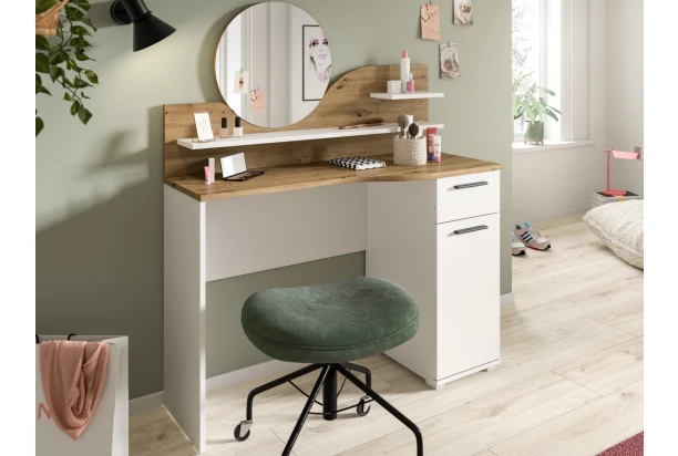 Toaletný stolík s okrúhlym zrkadlom a so zaoblenými tvarmi pôsobí veľmi elegantne. Pri tomto praktickom stolíku oceníte odkladacie poličky, na ktorých budete mať vždy všetko po ruke. Ďalšie veci môžete uschovať do šuplíka alebo úložného priestoru za otočnými dverami. Kozmetický stolík je vyrobený v kombinácii biela/dub artisan a má šírku 110 cm – nájde tak ľahko svoje miesto takmer v akejkoľvek spálni, kde budete mať priestor na všetky kozmetické potreby. Vďaka priestrannej doske, zásuvkám a zrkadlu ponúka toaletný stolík dostatok priestoru na uloženie make-upu, šperkov i ďalších osobných vecí.