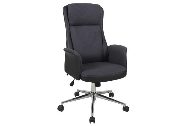 Elegantné kancelárske kreslo má pohodlne polstrovaný sedák s bočnými podrúčkami v kombinácii čierna ekokoža/tmavo šedá látka. Okrem otočného sedadla a klasického výškového nastavovania ponúka hojdaciu funkciu. Stabilná kovová podnož je vyrobená v chrómovo lesklom prevedení.