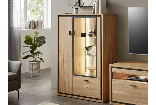 Skrinka s presklením z programu Flores – elegantný dizajn nábytku je doplnený kontrastným orámovaním predných plôch v antracitovom prevedení, ktoré zvýrazňuje prirodzené tóny útulného dubového drevodekoru. Tento moderný nábytok tak vdýchne do bytu pocit útulného prostredia, kde sa budete cítiť príjemne. Navyše oceníte kvalitné spracovanie aj ľahkú údržbu, čo pridáva na hodnote. Tento nábytok bude skvele pasovať do moderného aj klasicky zariadeného interiéru.