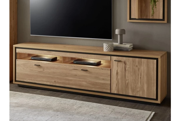 Široká TV skrinka z programu Flores – elegantný dizajn nábytku je doplnený kontrastným orámovaním predných plôch v antracitovom prevedení, ktoré zvýrazňuje prirodzené tóny útulného dubového drevodekoru. Tento moderný nábytok tak vdýchne do bytu pocit útulného prostredia, kde sa budete cítiť príjemne. Navyše oceníte kvalitné spracovanie aj jednoduchú údržbu, čo pridáva na hodnote. Tento nábytok bude skvele pasovať do moderného aj klasicky zariadeného interiéru.