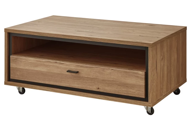 Konferenčný stolík so zásuvkou z programu Flores – elegantný dizajn nábytku je doplnený kontrastným orámovaním predných plôch v antracitovom prevedení, ktoré zvýrazňuje prirodzené tóny útulného dubového drevodekoru. Tento moderný nábytok tak vdýchne do bytu pocit útulného prostredia, kde sa budete cítiť príjemne. Navyše oceníte kvalitné spracovanie aj ľahkú údržbu, čo pridáva na hodnote. Tento nábytok bude skvele pasovať do moderného aj klasicky zariadeného interiéru. Stolík má kolečká pre ľahké presúvanie a priehradku, kam uložíte napríklad časopisy.