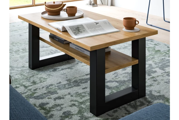 Obdĺžny konferenčný stolík s plochou 90×50 cm vyrobený v kombinácii dekoru dub artisan/antracit a dobre pasuje do modernej aj klasicky zariadenej obývačky. Zosilnená podnož poskytuje dobrú stabilitu.