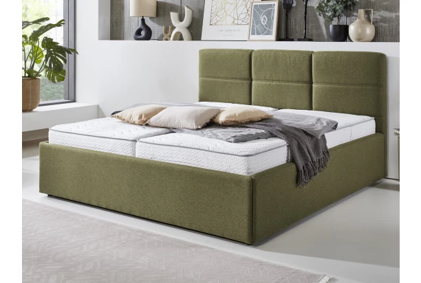 Trendová dvojlôžková posteľ s veľkosťou 140×200 cm sa hodí do každej moderne zariadenej spálne. Posteľ je očalúnená látkou vo farbe olivovo zelená a chrbtové čelo má doplnené okrasným dvojitým prešivom. Pri kombinácii s výklopným roštom je možné dolný priestor pod lôžkom využiť aj na praktické ukladanie rôznych vecí. Táto posteľ má tiež kompaktné rozmery konštrukcie a preto nezaberie zbytočne príliš miesta v priestore spálne – je teda dobrou voľnou aj do menšieho priestoru.