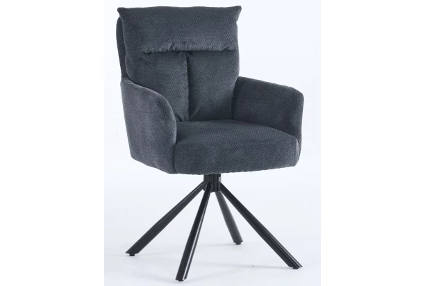 Jedálenská stolička v modernom elegantnom dizajne má komfortne mäkkučké vypolstrovanie vo vankúšovej optike. Sedák s pružinovým jadrom je otočný o 180 ° a čierna kovová podnož v kónickom tvare poskytuje stabilitu. Stolička je očalúnená mäkkou štruktúrovanou látkou vo farbe tmavo šedá, ktorá dotvára útulnú atmosféru v priestore jedálne.