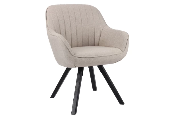 Pohodlná jedálenská stolička v tvare zaobleného kresielka je očalúnená tkaninou vo farbe béžová. Podnož z čierno lakovaného masívneho dreva zaisťuje stabilitu.