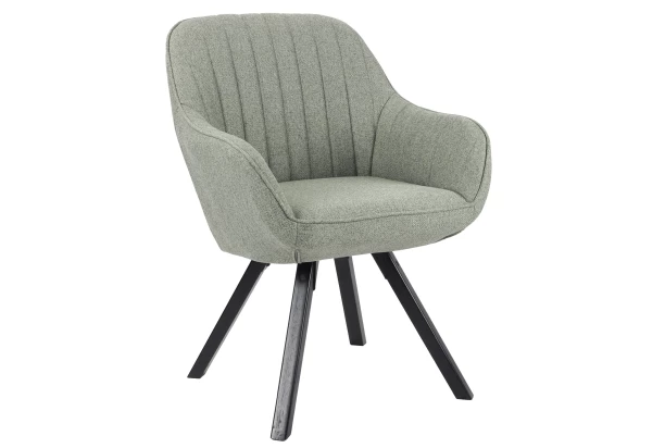 Pohodlná jedálenská stolička v tvare zaobleného kresielka je očalúnená tkaninou vo farbe svetlo zelená. Podnož z čierno lakovaného masívneho dreva zaisťuje stabilitu.