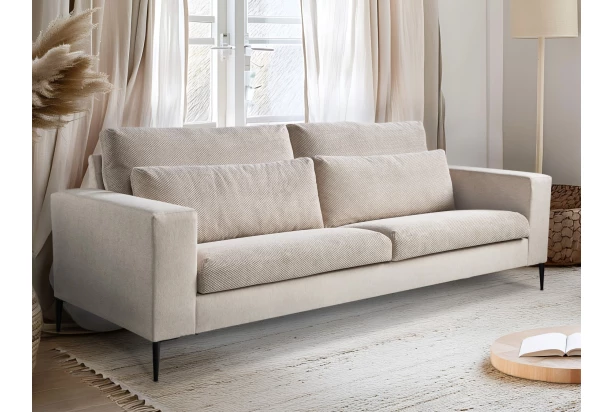 Moderná trojmiestna pohovka v nadčasovom štýle má čisté línie a elegantný dizajn, ktorý sa hodí takmer do každej obývačky. Priestranné sedenie a dvojitá vrstva vankúšov zaistia maximálny komfort pri každodennom odpočinku. Stabilné nôžky z čierneho kovu dodávajú ľahkosť, pôsobia vzdušne a súčasne zaručujú pevnosť. Pohovka je očalúnená kombináciou jemne štruktúrovanej a výrazne štruktúrovanej látky s 3D efektom vo farbe béžová, ktorá je príjemne mäkkučká na dotyk a zaujímavá na pohľad. Táto pohovka je ideálna voľba pre tých, ktorí hľadajú spojenie štýlu a pohodlia.