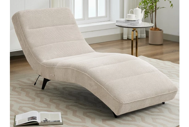 Relaxačné lehátko s elektrickým polohovaním je skvelým dizajnovým doplnkom do interiéru a zároveň poskytne príjemný komfort počas relaxácie, čítania alebo sledovania televízie. Pomocou tlačidiel si môžete ľahko nastaviť sklon operadla podľa aktuálnej potreby. Táto komfortná leňoška je očalúnená výrazne štruktúrovanou látkou s 3D efektom vo farbe svetlo béžová, ktorá je príjemne mäkkučká na dotyk a zaujímavá na pohľad. Moderný dizajn lehátka dopĺňajú čierne kovové nohy, ktoré dodávajú nábytku potrebnú stabilitu.