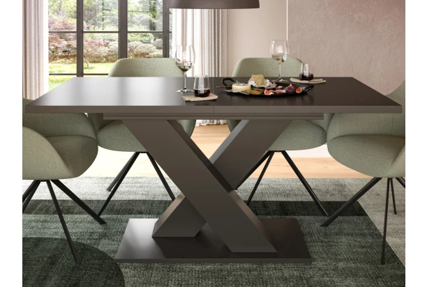 Jedálenský stôl v modernom dizajne má stabilnú podnož v tvare X, praktickú rozkladaciu funkciu a navyše zaujme na pohľad. Vyrobený v kombinácii tmavo šedá/tmavo šedá. Obdĺžnikovú jedálenskú dosku s veľkosťou 150×90 cm ľahko predĺžite na šírku 190 cm. Tento moderný jedálenský stôl sa stane stredobodom každého stretnutia – či už ide o večeru vo dvojici alebo hostinu pre celú rodinu. Jeho moderný dizajn zaujme na prvý pohľad, zatiaľ čo kvalitne spracovaná konštrukcia zaisťuje výbornú stabilitu aj pri plnom rozložení. Vďaka rozkladacej funkcii sa ľahko prispôsobí vašim potrebám – behom chvíľky ponúkne miesto aj pre početnejšiu návštevu. Tento obdĺžnikový stôl spája estetickosť aj funkčnosť v jeden výrazný kus nábytku, ktorý prakticky poslúži počas každého dňa. Tento stôl je ideálnou voľbou pre tých, ktorí hľadajú nábytok s dôrazom na moderný design, stabilitu aj funkčnosť.