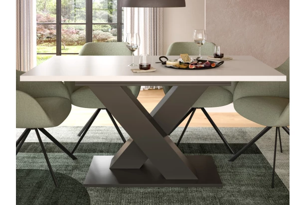 Jedálenský stôl v modernom dizajne má stabilnú podnož v tvare X, praktickú rozkladaciu funkciu a navyše zaujme na pohľad. Vyrobený v kombinácii biela/tmavo šedá. Obdĺžnikovú jedálenskú dosku o veľkosti 150×90 cm ľahko predĺžite na šírku 190 cm. Tento moderný jedálenský stôl sa stane stredobodom každého stretnutia – či už ide o večeru vo dvojici alebo hostinu pre celú rodinu. Jeho moderný dizajn zaujme na prvý pohľad, zatiaľ čo kvalitne spracovaná konštrukcia zaisťuje výbornú stabilitu aj pri plnom rozložení. Vďaka rozkladacej funkcii sa ľahko prispôsobí Vašim potrebám – behom chvíľky ponúkne miesto aj pre početnejšiu návštevu. Tento obdĺžnikový stôl spája estetickosť aj funkčnosť v jeden výrazný kus nábytku, ktorý prakticky poslúži počas každého dňa. Tento stôl je ideálnou voľbou pre tých, ktorí hľadajú nábytok s dôrazom na moderný design, stabilitu aj funkčnosť.