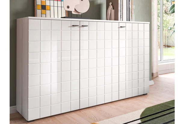 Skrinka 3-dverová z radu Monty v kombinácii biela/biely lesk zaujme na pohľad zaujímavo štruktúrovanými povrchmi s geometrickým vaflovým vzorom skvele doplní moderný interiér. Skrinka so šírkou 138 cm má 3 otočné dvere, za ktorými nájdete úložné priestory s výškovo nastaviteľnými policami, kam môžete univerzálne ukladať oblečenie, časopisy alebo akékoľvek iné veci. Tento nábytok je vyrobený z certifikovaného dreveného materiálu FSC® a je synonymom nielen pre kvalitu, ale aj pre udržateľnosť a ochranu životného prostredia. Táto úložná skrinka sa hodí do každého moderne ladeného bytu, kde urobí parádu a zároveň prakticky poslúži.