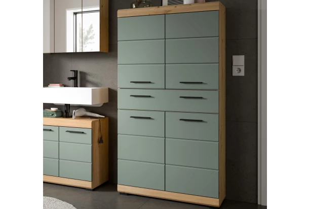 Vyššia skrinka so zásuvkou z programu Scout – moderný, elegantný a zároveň praktický nábytok v kombinácii dub artisan s matne šalviovo zelenými plochami. Predné plochy so skosenou hranou a decentne frézovanými líniami sú príjemným detailom. Táto úložná skrinka so šuplíkom prakticky poslúži nielen v priestore kúpeľne, ale aj kdekoľvek inde, kde potrebujete ukladať najrôznejšie veci.