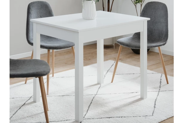 Jedálenský stôl s veľkosťou 90×67 cm je ideálnou voľbou do menšej jedálne alebo kuchynského kúta. Oceníte univerzálny vzhľad aj pevnú a stabilnú konštrukciu so štyrmi nohami. Prevedenie v bielej matnej farbe pôsobí čisto a nadčasovo a ľahko sa kombinuje s rôznymi štýlmi interiéru.