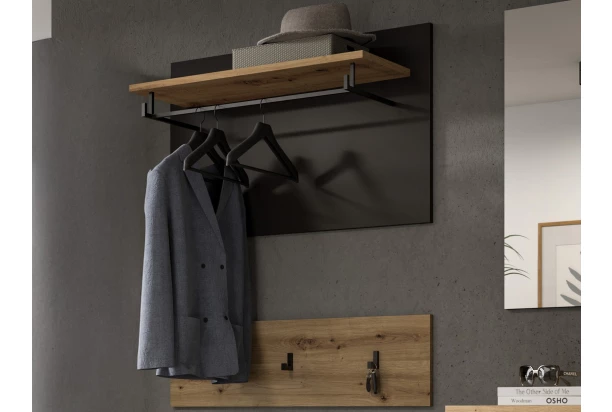Dvojdielny šatníkový panel z kolekcie Cano – moderný nábytok, kde sa snúbi praktickosť a nadčasová elegancia. Tmavosivé plochy v kombinácii s drevodekorom dub artisan pôsobia navyše veľmi útulným dojmom. tento dvojdielny panel so šírkou 80 cm sa skladá z dvoch častí, ktoré môžete umiestniť samostatne alebo k sebe. Horná časť má odkladaciu policu na odkladanie šatníkových doplnkov a šatníkový panel na zavesenie ošatenia. Dolná časť má 3 závesné háčiky na zavesenie vrchného oblečenia, tašiek alebo kľúčov. Tento nábytok je ideálna voľba pre tých, ktorí hľadajú nadčasový štýl, ktorý je estetický aj funkčný zároveň.