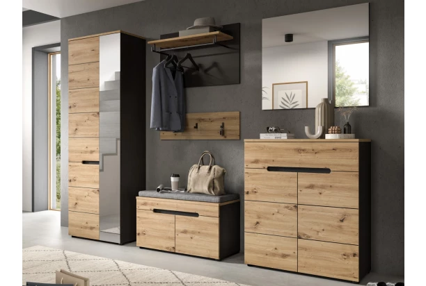 Predsieňová 6-dielna zostava z kolekcie Cano – moderný nábytok, kde sa snúbi praktickosť a nadčasová elegancia. Rovné priamočiare línie dodávajú nábytku moderný charakter, zatiaľ čo zaoblené detaily vytvárajú elegantný harmonický kontrast. Tmavosivé plochy v kombinácii s drevodekorom dub artisan pôsobia navyše veľmi útulným dojmom. Predsieňová stena je zložená celkom zo 6 dielov: predsieňová skriňa so zrkadlom, predsieňová lavica, šatníkový panel s háčikmi, šatníkový panel s tyčou na zavesenie ošatenia, skrinka s policami s využitím ako botník a nástenné zrkadlo. Tento nábytok je ideálna voľba pre tých, ktorí hľadajú nadčasový štýl, ktorý je estetický aj funkčný zároveň.