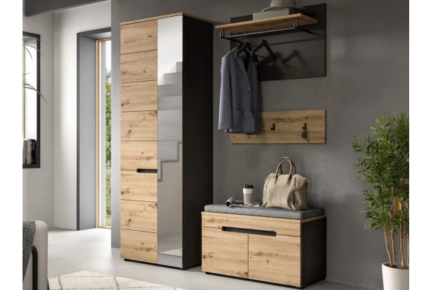 Predsieňová 4-dielna zostava z kolekcie Cano – moderný nábytok, kde sa snúbi praktickosť a nadčasová elegancia. Rovné priamočiare línie dodávajú nábytku moderný charakter, zatiaľ čo zaoblené detaily vytvárajú elegantný harmonický kontrast. Tmavosivé plochy v kombinácii s drevodekorom dub artisan pôsobia navyše veľmi útulným dojmom. Predsieňová stena je zložená celkom zo 4 dielov: šatníková skriňa so zrkadlom, predsieňová lavica, šatníkový panel s háčikmi a šatníkový panel s tyčou pre zavesenie ošatenia. Tento nábytok je ideálna voľba pre tých, ktorí hľadajú nadčasový štýl, ktorý je estetický aj funkčný zároveň.