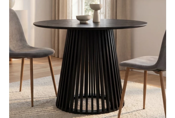 Atraktívny okrúhly jedálenský stôl v dekore čierny jaseň má priemer 100 cm a zaujme lamelovým dizajnom podstavy. Podstava v tvare kužeľa zaisťuje stabilitu počas každodenného využívania a zároveň pôsobí v interiéri vzdušným dojmom. Tento krásny elegantný stôl sa tak stane štýlovým stredobodom priestoru vašej jedálne.