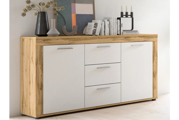 Komoda z kolekcie Jana – nábytok v modernom, nadčasovom štýle vyzerá elegantne a zároveň je praktický na každodenné použitie. Rovné línie v kombinácii dekoru Wotan dub/biela sú ešte viac zvýraznené obľúbeným vzhľadom širokých predných rámov. Tento nábytok je vyrobený z dreveného materiálu s certifikátom FSC® a je synonymom nielen kvality, ale aj udržateľnosti a ochrany životného prostredia. Komoda so šírkou 125 cm ponúka kombináciu zásuviek na uloženie drobných predmetov, ako aj vnútorné priestory za výklopnými dvierkami, kde si môžete uložiť napríklad oblečenie alebo väčšie predmety. Táto skrinka bude praktickou a zároveň estetickou súčasťou moderného bytu.