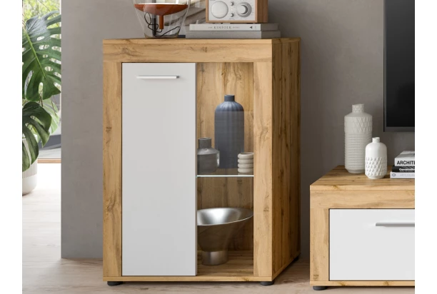 Stojacia/závesná vitrína z kolekcie Jana – nábytok v modernom nadčasovom štýle pôsobí elegantne a zároveň prakticky poslúži počas každého dňa. Priamočiare línie v kombinácii dekoru dub wotan/biela navyše zvýrazňuje obľúbená optika širokých predných rámov. Tento nábytok je vyrobený z certifikovaného dreveného materiálu FSC® a je synonymom nielen pre kvalitu, ale aj pre udržateľnosť a ochranu životného prostredia. Vitrínu so šírkou 60 cm môžete univerzálne zavesiť na stenu alebo umiestniť klasicky na podlahu. Za 2 otočnými dverami nájdete policu zo skla – za presklené dvere umiestnite napríklad dekorácie a za plné dvere treba akékoľvek iné predmety. Táto skrinka tak bude praktickou a zároveň estetickou súčasťou moderného bytu.
