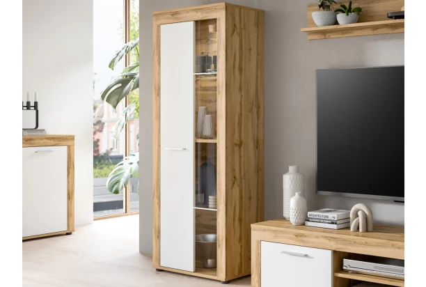 Vysoká vitrína z kolekcie Jana – nábytok v modernom nadčasovom štýle pôsobí elegantne a zároveň prakticky poslúži počas každého dňa. Priamočiare línie v kombinácii dekoru dub wotan/biela navyše zvýrazňuje obľúbená optika širokých predných rámov. Tento nábytok je vyrobený z certifikovaného dreveného materiálu FSC® a je synonymom nielen pre kvalitu, ale aj pre udržateľnosť a ochranu životného prostredia. Vitrína so šírkou 60 cm má čiastočne presklené dvere, za ktorými nájdete police, kam môžete vystaviť svoje obľúbené predmety. Táto vitrína tak bude praktickou a zároveň estetickou súčasťou moderného bytu
